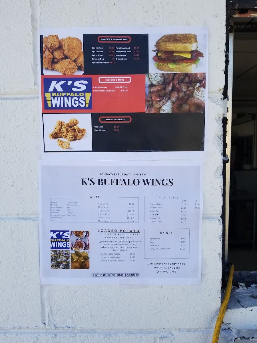 Welcome to K's Buffalo Wings, a hidden gem located at 230 Sand Bar Ferry Rd, Augusta, GA. This unassuming spot boasts some of the best wings in town, drawing rave reviews from patrons. Dive into lunch specials featuring four mouthwatering wings, fries, and refreshing pink lemonade, a perfect midday treat.